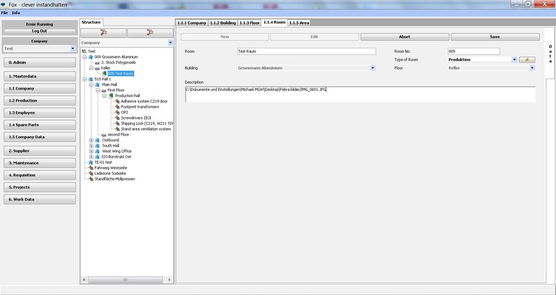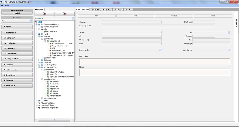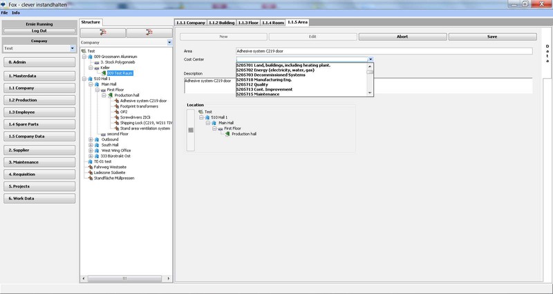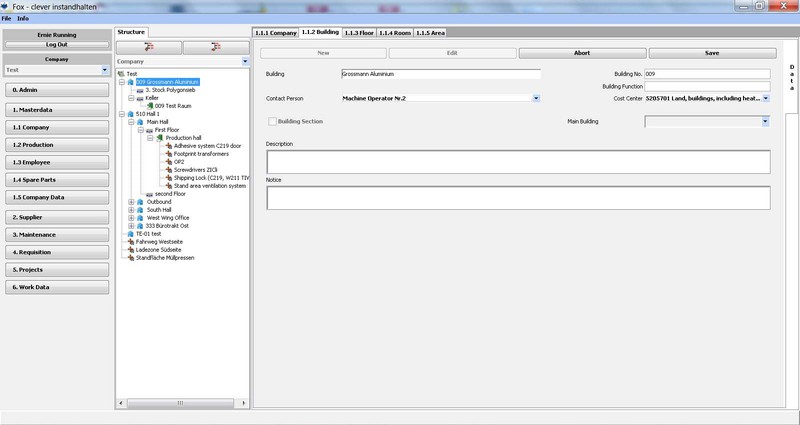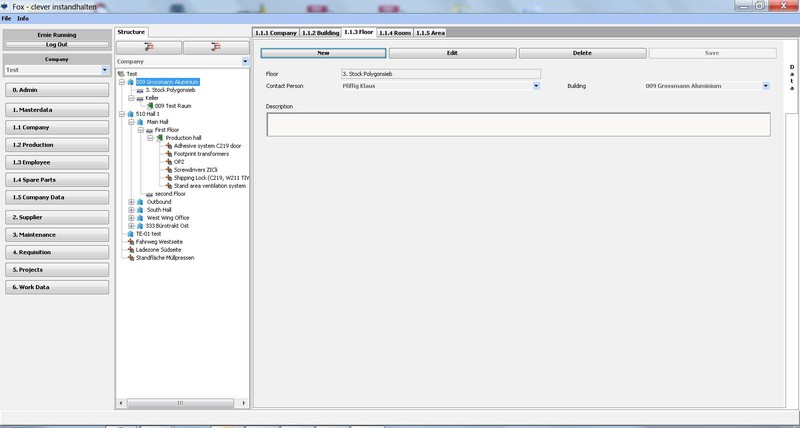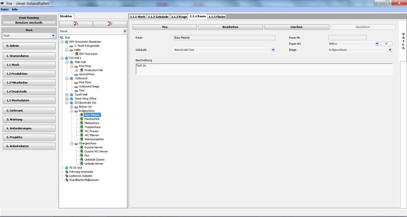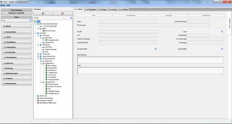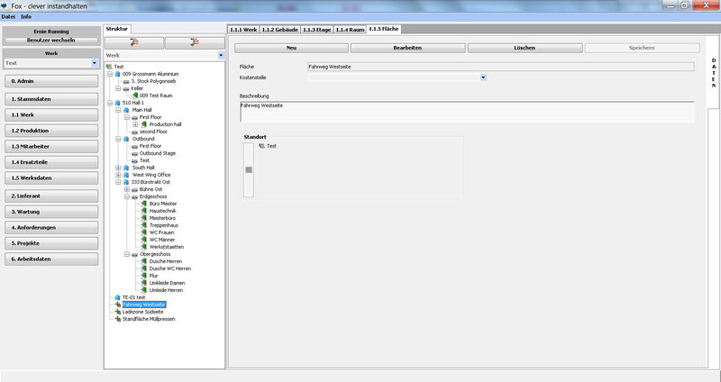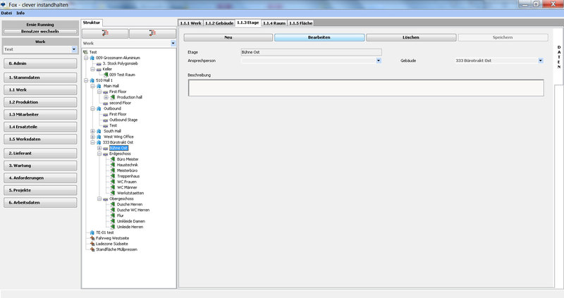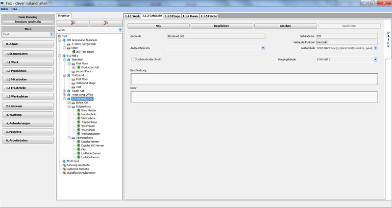 Das Werk kann in seiner tatsächlichen baulichen Anordnung erfasst, über Gebäude/Etagen/Räume und Flächen im “Baum” dargestellt werden. Wobei Flächen in allen Ebenen (z.B. Werk